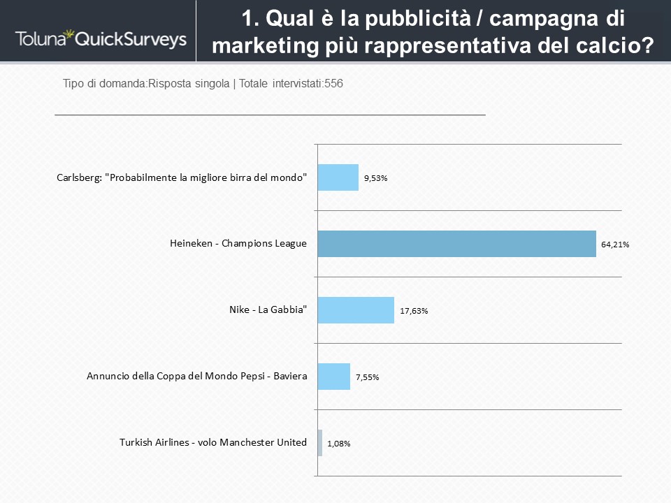 Nel panorama calcistico in generale ci è riuscito con assoluto successo Heineken. Il 64% degli intervistati ha infatti consegnato la medaglia d’oro per la “campagna marketing più rappresentativa del calcio” alla pubblicità realizzata dalla birra bionda olandese in occasione della Champions League.