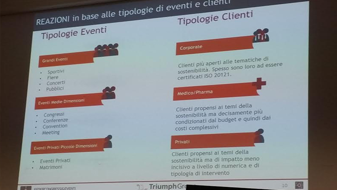 Veronica del Fiacco, di Triumph Group International, ha invece portato la testimonianza come Pco (vedi slide). "Siamo certificati ISO 9007 dal 2003 e a ottobre 2016 abbiamo aderito alla ISO 20121. Come organizzatori di congressi siamo nella posizione più difficile, perché dobbiamo continuamente mediare tra la nostra volontà di applicare criteri di sostenibilità e i clienti. Il problema più grande è il budget: la sostenibilità ha ancora un costo molto alto".