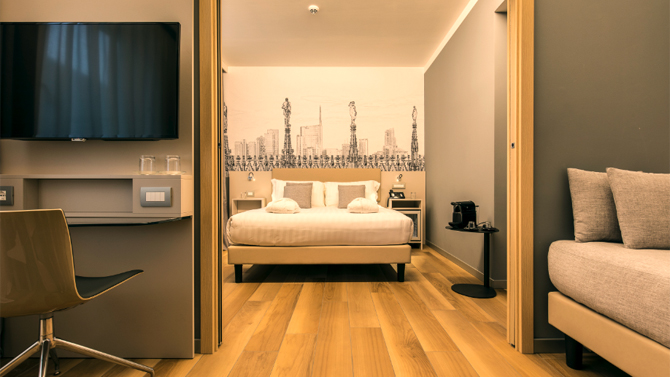 Nella Junior Suite, in dotazione per gli ospiti anche macchina Nespresso e bollitore per il tè. E poiché, quando si viaggia, è importante avere una sensazione del luogo in cui ci si trova, le pareti delle camere sono decorate con un elegante skyline che coniuga aspetti della vecchia e nuova Milano – per sentirsi nella metropoli meneghina un po’ come a casa.