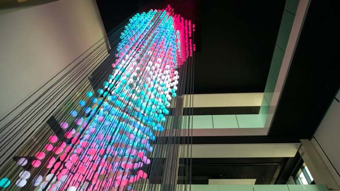 L’Icona di Donna è invece una suggestiva statua di luce ed è il cuore pulsante di FRI. Alta oltre 10 metri, sospesa nell’aria, è la protagonista dell’intero edificio ed è visibile da tutti i tre piani in cui si articola la Fondazione. La figura di donna è composta da 21.120 LED inseriti all’interno di 5.280 sfere bianche opaline che, accendendosi a ritmo di un concerto digitale, la vestono come un tessuto di luce, riproducendo particolari texture conservate nell’archivio diFRI.