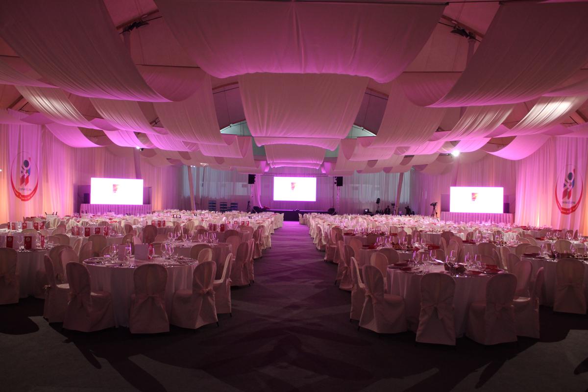 Le dotazioni di base del PalaVela (35 m di larghezza sul fronte lago e 55 m di lunghezza, con un’altezza di 5 m e la possibilità di appendimenti fino a 7,5 m) consentono di trasformare la location velocemente e ottimizzando gli allestimenti, grazie a un sistema di divisorie che permettono di suddividere gli spazi per più utilizzi contemporanei, prevedendo una sala conferenze da 400 posti, spazio espositivo e di networking e un open space per cena sociale o di gala. Per queste ultime occasioni, per esempio, è possibile far calare dal soffitto lampadari di design a creare la giusta atmosfera; e le eleganti sedute utilizzate per la conferenza si trasformano in poltroncine per una moderna mise en place.