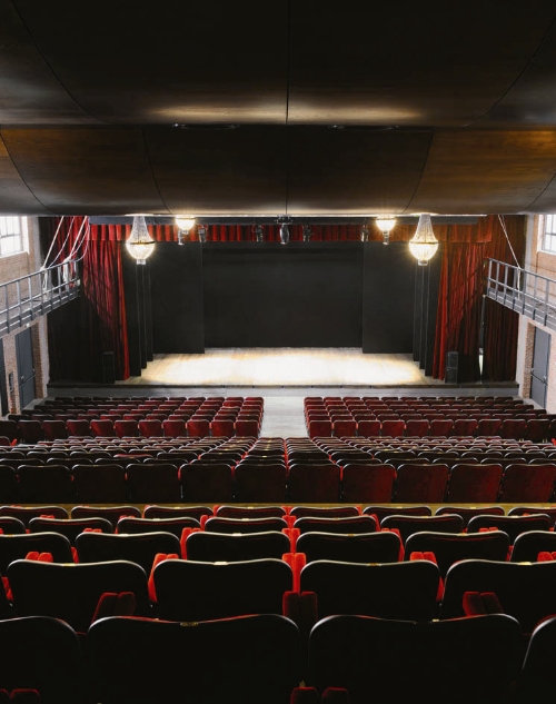 Il Foyer è un open space con molteplici funzioni: reception, meeting/dining area, work space e palcoscenico, per 400 mq collegati con tutti gli spazi e e le attività del teatro. La grande sala teatrale misura 540 mq con 500 posti a sedere.