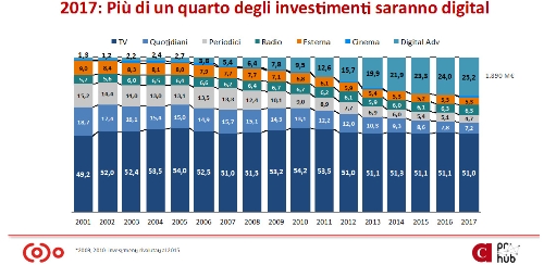 Ma se la stampa continua a soffrire, con un calo degli investimenti del 5,4% nel 2016 e del 5,3% previsto per il 2017, il prossimo anno il digitale diventerà l'unico vero grande driver di crescita unendo ad alti tassi di sviluppo un'importante quota sul totale della spesa: nel 2017 questo settore rappresenta infatti il 25% degli investimenti complessivi.
