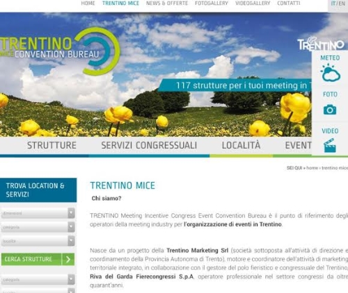 Il nuovo sito di Trentino MICE Convention Bureau offre un servizio di venue finder che permette di scoprire e conoscere l’offerta del Trentino in termini di hotel, centri congressi, location insolite e fornitori di servizi (allestitori, catering, DMC-Destination Management Company...).