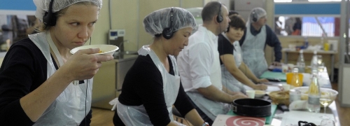 Nella Scuola di Cucina si sovverte il rapporto tra cuochi e pubblico: non più show come nel Teatro del Gusto, ma momento di scambio in cui i partecipanti vengono coinvolti in prima persona nella genesi di un piatto.