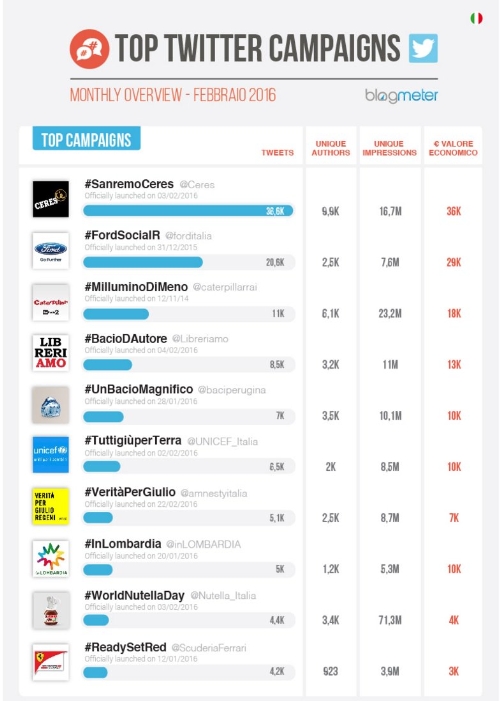Questo dato assume ancora più valore se si pensa che il risultato è stato ottenuto senza alcun investimento in advertising. inLombardia si posiziona all’ottavo posto della classifica complessiva Top Twitter Campaigns di BlogMeter, l’osservatorio che ogni mese svela le campagne hashtag più twittate.