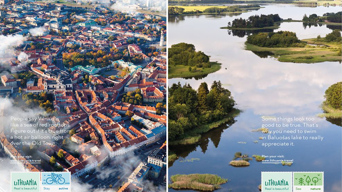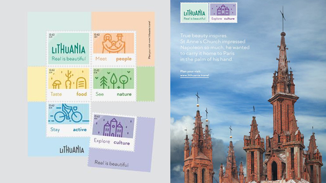 Il nuovo logo del turismo della Lituania è ispirato nella forma e nel colore – verde menta pastello – a un francobollo, che incornicia lo slogan del turismo 'Lithuania. Real is beutiful'. Il font è dinamico e animato e richiama i rami degli alberi e la natura, protagonista del paesaggio lituano. Nei diversi strumenti di comunicazione e marketing, il logo principale sarà accompagnato a marchi tematici complementari, ciascuno associato a una delle caratteristiche del turismo in Lituania: 'Meet people', 'Taste Food', 'Stay Active', 'See Nature', 'Explore Culture'.