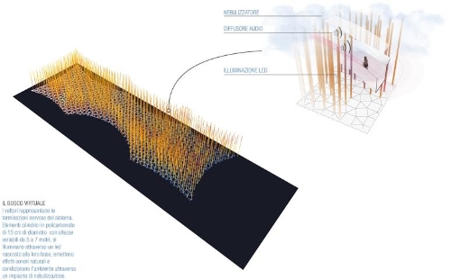 Realizzati con tubi in policarbonato trasparente del diametro di 150 mm e di altezze variabili tra 5,30 e 7 metri, i vettori generano un bosco virtuale illuminato attraverso una serie di lampade a Led collocate sulla griglia.