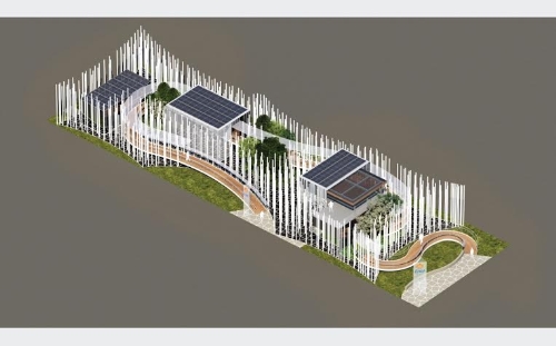 Il sistema è alimentato da energia ricavata da pannelli fotovoltaici posti sui volumi del padiglione.