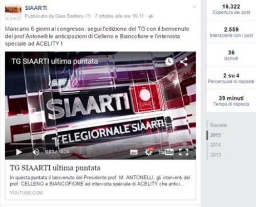 Il lavoro editoriale ha portato alla creazione di uno speciale TG Siaarti in uscita da fine luglio ogni settimana e proseguito durante il congresso con interviste ai vari relatori sulle tematiche scientifiche poi pubblicate sui canali social media (Facebook, Twitter) ottenendo in media 675 visulizzazioni per ogni edizione sul canale YouTube di Siaarti.