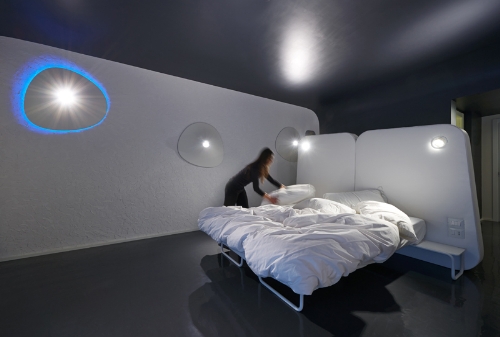 Il letto ampio e soffice contraddistingue il fulcro spaziale della camera, la testata estesa e dagli angoli stondati funge inoltre da armadio, e dello spazio costituisce il centro vitale. Un tocco di colorata modernità è data dai graffiti sui balconi che con ironia sorprendono l’occhio del visitatore sedotto dall’arsenico Lupin e l’intrigante Diabolik.