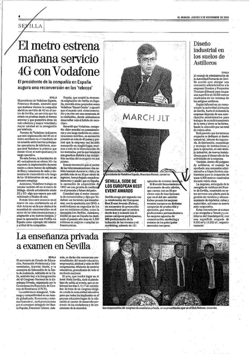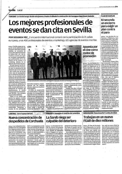 Alla conferenza stampa di mercoledì 4 novembre a Siviglia erano tutti presenti per dare il benvento ad ADC Group e all'EuBea Festival: Antonio Conde, vice president Prodetur; Antonio Muñoz, delegate of Tourism City Council of Seville; Salvador Fernández, director Chamber of Commerce, Manuel Macìas, director Sevilla Congress & Convention Bureau; Arturo Serra, president Sevilla Congress & Convention Bureau.