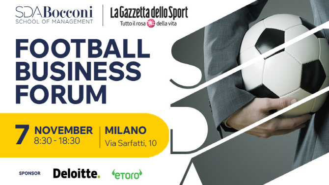Presentato in anteprima durante il Festival dello Sport di Trento lo scorso anno, il Football Business Forum, ideato da La Gazzetta dello Sport e da SDA Bocconi School of Management, debutta il 7 novembre a Milano, nel Campus di SDA Bocconi, come nuovo appuntamento che riunisce i protagonisti dell’industria calcistica globale.