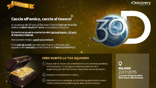 In occasione del suo 30° compleanno, Discovery Channel, il canale dell’area 400 di Sky, organizza una Caccia al tesoro tramite App ispirata al mondo che ha fatto grande il canale e ai generi più rappresentativi della sua evoluzione.