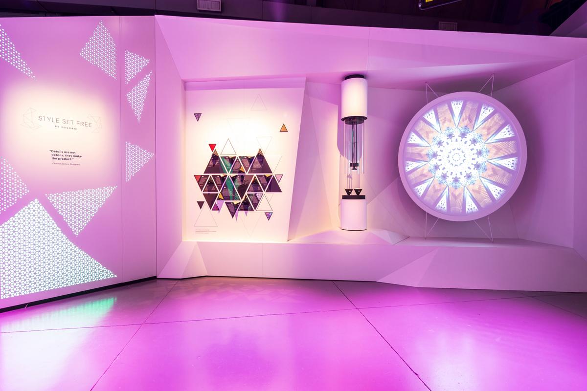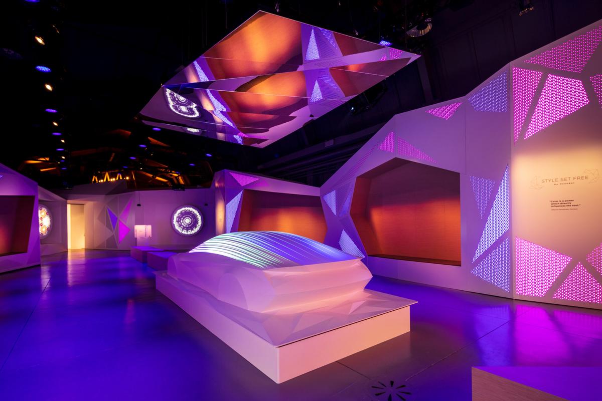 Un’installazione creativa e in costante evoluzione mostra i tre elementi chiave degli interni di un’auto legati alla nuova Brand Experience Hyundai: Colori & Luci, Materiali, Forme & Suoni. Ognuno di questi tre elementi è portato in vita attraverso una grafica digitale animata ad alta definizione e da diverse installazioni interattive che conducono in un'esperienza di un viaggio sensoriale di dodici minuti.