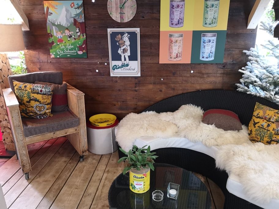 Lo chalet a marchio Ricola è naturalmente riconoscibile dal colore giallo e, al suo interno, pronto ad accogliere il pubblico con alcuni elementi che raccontano la sua storia e altri invece incentrati sulle 13 erbe svizzere, alla base delle golose caramelle e delle tisane dall’effetto rigenerante.
