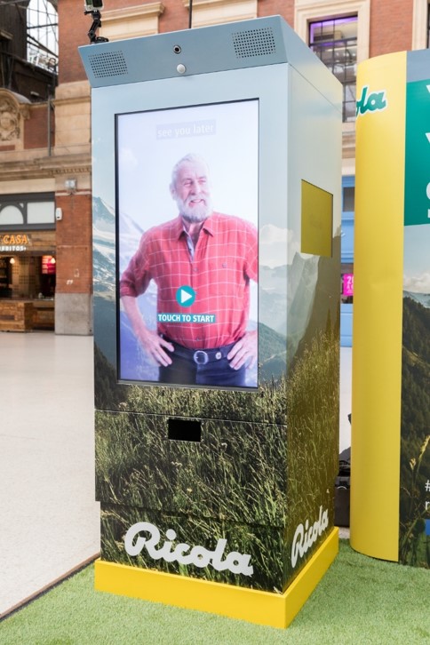 Mentre il concorrente degusta la caramella Ricola può rivedere la registrazione del suo contributo attraverso un monitor posto a lato della vending machine.