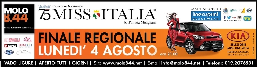La finale regionale Miss Kia Liguria sarà ospitata la sera di lunedì 4 agosto sulla meravigliosa terrazza al livello uno di Molo 8.44 a Vado Ligure.