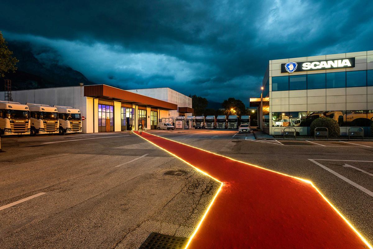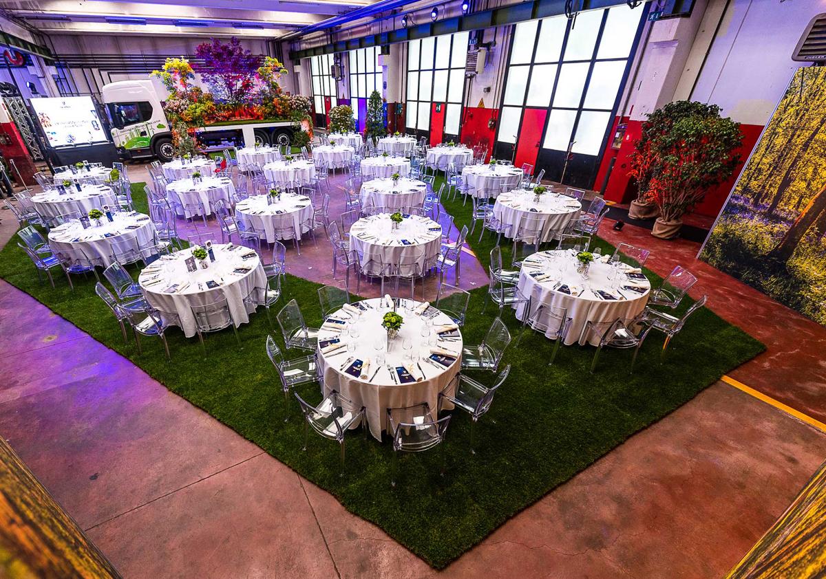 Per la cena di gala un’intera officina è stata trasformata in un’area verde con prati naturali e giardini pensili sulle motrici. Una soluzione architettonica che trasmette i valori di Scania: progresso tecnologico e sostenibilità ambientale.