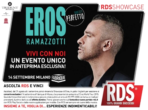 In attesa del debutto previsto il prossimo 16 settembre all'Arena di Verona, Eros Ramazzotti si esibirà al Fabrique di Milano - il 14 settembre - per uno showcase esclusivo firmato RDS per cento ascoltatori che potranno vivere l’emozione di essere i protagonisti della presentazione mondiale dell'Eros World Tour 2015, di cui RDS è media partner.