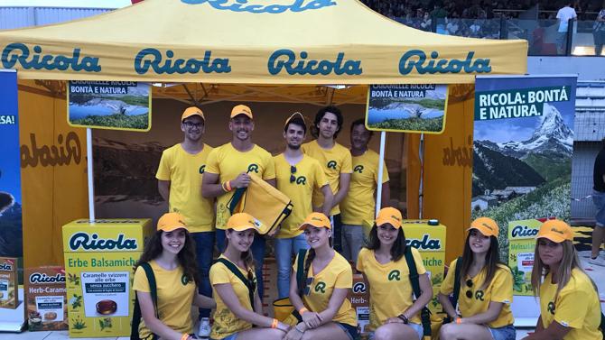Durante tutte le date è possibile incontrare il brand presso i due gazebo situati nell’area parterre degli stadi, da cui parte il sampling itinerante delle ragazze e dei ragazzi Ricola, che spiccano in mezzo alla folla grazie al giallo delle divise, tratto distintivo del marchio.
