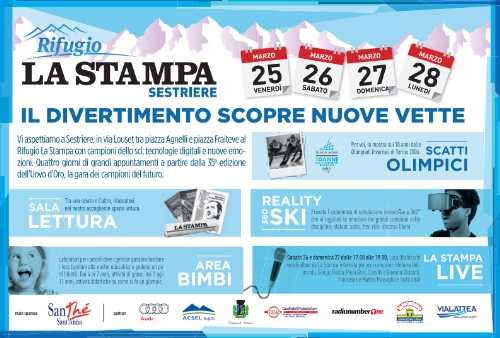 Dopo il successo dell’edizione 2015 a Courmayeur e di quella, recentissima, a La Thuile in occasione delle Gare di Coppa del Mondo femminile di sci alpino (vedi notizia correlata a fondo pagina), ritorna in Piemonte il Rifugio La Stampa, questa volta a Sestriere nei giorni delle festività pasquali.