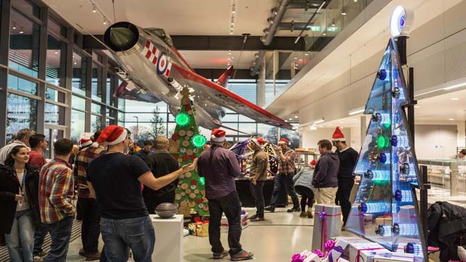 Twistmastree: Per metà tradizionale e per metà ingegnerizzato, questo albero è ispirato alla meccanica degli ingranaggi. Costruito con più di 54 perni e ruote dentate, l’albero usa queste interconnessioni per alimentare un orologio che scandisce il countdown al Natale.