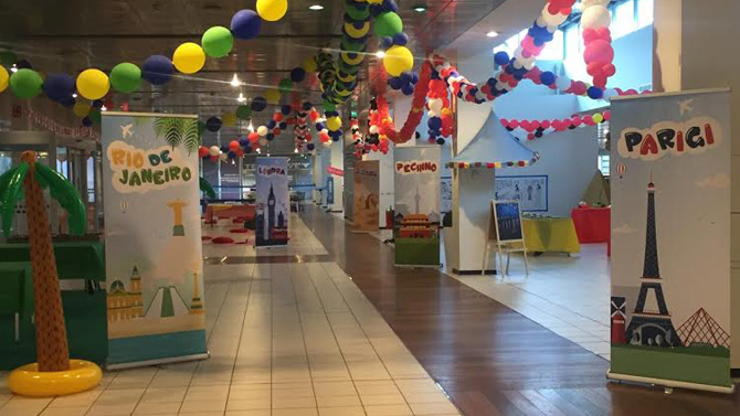 E nel pomeriggio, finalmente, una merenda con mamma e papà con sorpresa finale. Tutto è perfettamente a tema: la location che ospita l’evento è stata allestita con veri e propri set scenografici con bandiere, palloncini colorati che richiamano i colori dei diversi Paesi, un mappamondo gigante gonfiabile, una grande piramide, grattacieli ed elementi che connotano le città toccate con questo meraviglioso e immaginario giro del mondo.