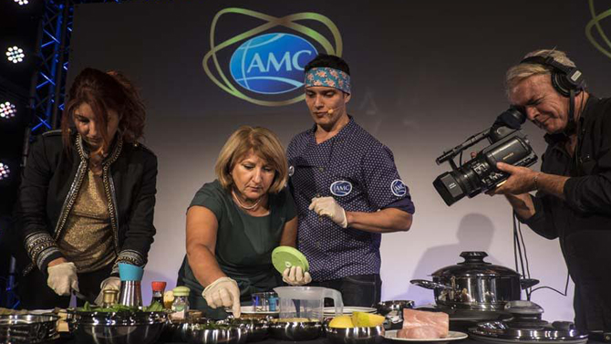 Oltre 30 ore di prove, 1 giorno completo per realizzare un allestimento impattante con un palco di quasi 20 metri sul quale è stato posato uno schermo unico di 16 metri per 4 e un sistema per gestire una cucina mobile che veniva portata in scena e fatta uscire immediatamente a fine servizio per le prove tecniche e le dimostrazioni. Giochi di luce, la sala meeting della Sheraton che per due giorni è diventata il PalaAMC e una regia di 8 persone a gestire sound, light e contributi video, foto e videografici.