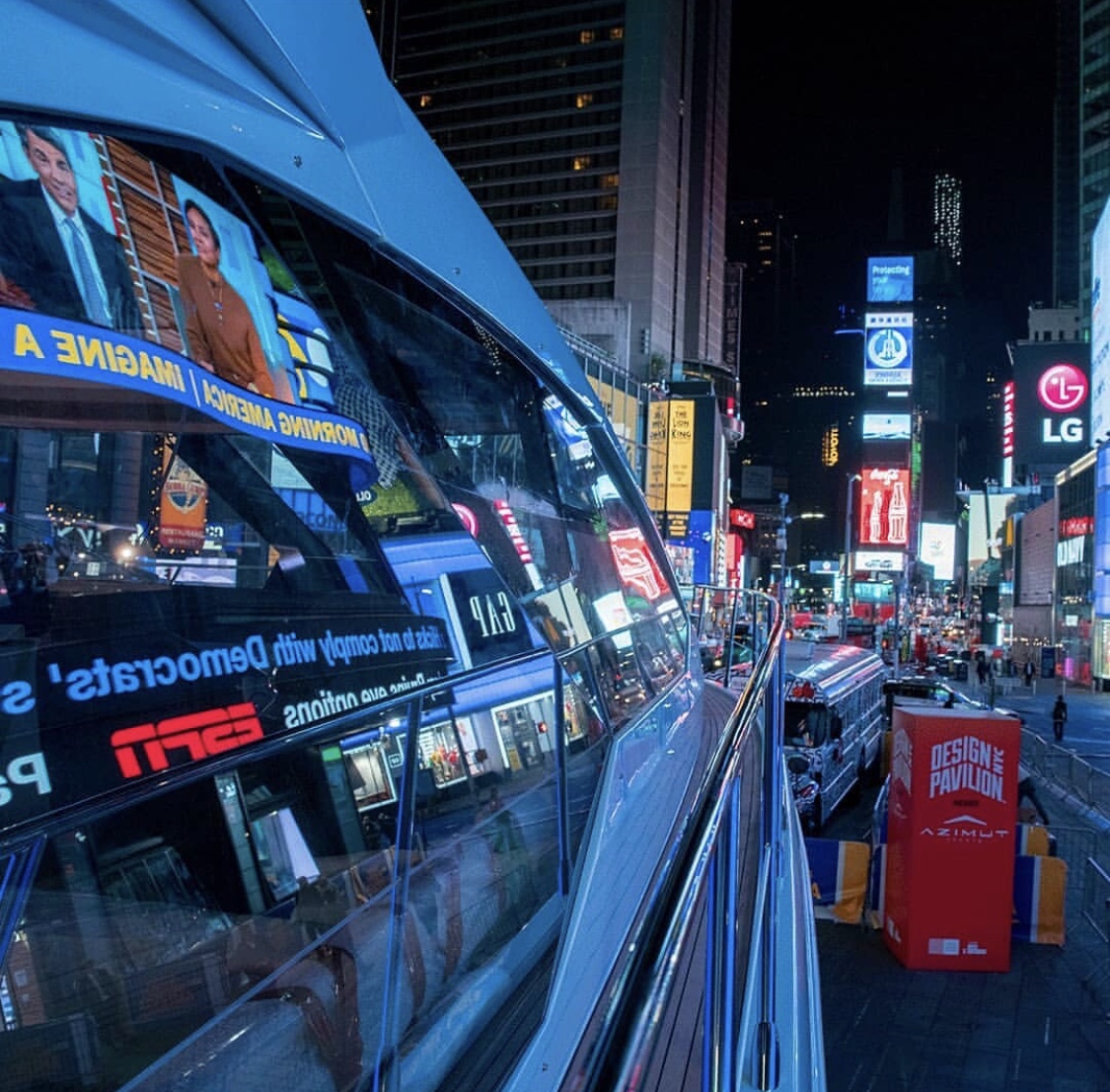 Una barca di 60 piedi fuori dal suo contesto marino, posizionata in una piazza densamente popolata di neon e molto iconica altera la percezione del consueto e del possibile ed è così che simbolicamente rappresenta la spinta innovativa in design e tecnologia che contraddistingue i progetti del Gruppo. Per Azimut essere al centro di quella che i newyorchesi chiamano “The Crossroad of the World” significa collocarsi al centro simbolico della contemporaneità, nello snodo cruciale di una rete, una rappresentazione delle contaminazioni globali.