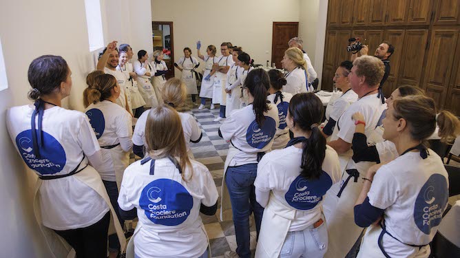 Costa Crociere apre i festeggiamenti per il suo 75° anniversario a Genova con un’iniziativa a favore delle persone più bisognose, che ogni giorno si rivolgono alla Comunità di Sant’Egidio. Oggi, presso il chiostro della Basilica della Santissima Annunziata di Genova, il Corporate Chef di Costa Crociere, Antonio Brizzi, aiutato dai volontari della Comunità di Sant’Egidio e dai dipendenti della sede centrale di Genova della compagnia, ha preparato un pranzo per circa 150 ospiti della Comunità: famiglie con bambini e anziani in difficoltà, e persone senza una dimora, che vivono quotidianamente la dura realtà della strada. L’iniziativa, co-ordinata da Costa Crociere Foundation, ha visto la partecipazione dello chef Bruno Barbieri, che firma l’eccellenza gastronomica a bordo delle navi Costa.