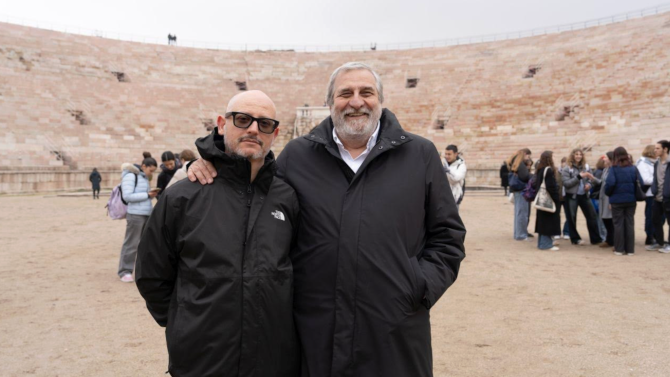 Due grandi spettacoli che si terranno all’Arena di Verona, all’interno di un monumento storico patrimonio dell’Umanità, che celebrano bellezza, movimento e spirito umano, accomunati da un linguaggio scenico innovativo e da una visione profondamente italiana, pensata per il pubblico globale. A guidare le squadre di creativi Alfredo Accatino (a destra in foto), Presidente di Filmmaster e Direttore Artistico delle due Cerimonie, insieme ad Adriano Martella (a sinistra in foto), Head of Creative di Filmmaster e Direttore Creativo delle Cerimonie.