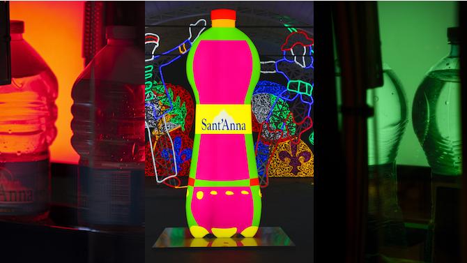 Insieme alle foto di Silvano Pupella viene esposta anche la scultura “Per Aqua Ad Lucem”, realizzata dall’artista Marco Lodola. L’opera vuole rappresentare l’iconica bottiglia di Acqua Sant’Anna, maestosa nelle dimensioni e impreziosita con anima e fasce in alluminio, frontali in metacrilato e pellicole a stampa digitale in vinile polimerico con protezione UV. Si tratta di un vero e proprio esempio di arte applicata realizzato da uno degli artisti italiani più famosi: Marco Lodola è uno scultore poliedrico famoso per le opere luminose in plexiglas e che ha fondato con un gruppo di artisti il movimento del Nuovo Futurismo.
