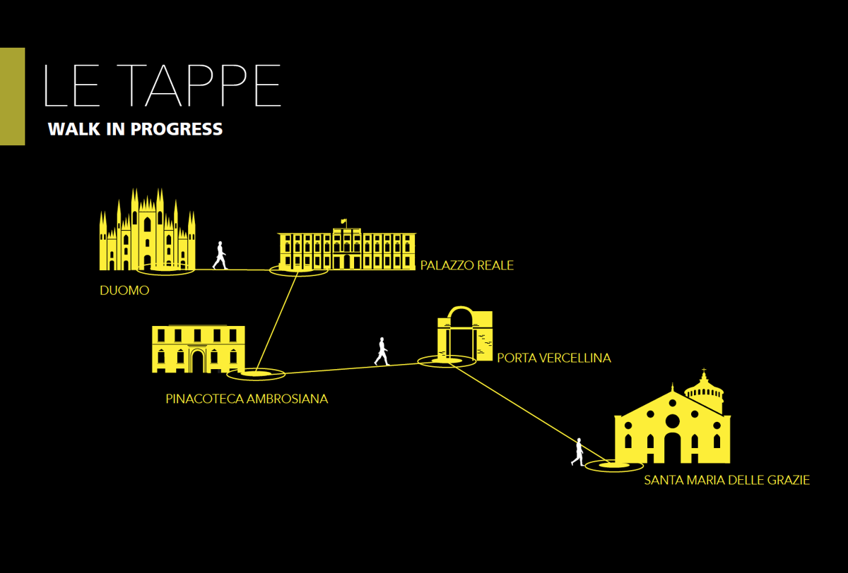 Verrà compiuto concretamente un percorso a piedi di circa un miglio lombardo (1,8 km) della durata di 1 ora e 40 minuti, durante la quale il visitatore vedrà ricostruirsi e animarsi l’area intorno a sé, così come le opere d’arte connesse alla narrazione, che verranno visualizzate e raccontate in ambienti limbo a 360°.