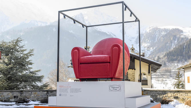 Sei gli allestimenti firmati in centro e in quota quest’anno. A dare il benvenuto ai visitatori della località, nella centralissima Piazza Brocherel, è stata l’iconica Vanity Fair di Poltrona Frau in versione XXL (nella foto, ph Giacomo Buzio), scenografica protagonista dell’installazione firmata da Gio Latis STUDIO con la collaborazione tecnica di Colsam. Alcune boutique del centro hanno raccontato il percorso progettuale dell’architetto Giulio Cappellini, Compasso d’Oro alla Carriera nel 2022, attraverso una selezione di oggetti e progetti esposti in vetrina nell’allestimento lucido e vivace dell’architetto e designer Ilaria Marelli.