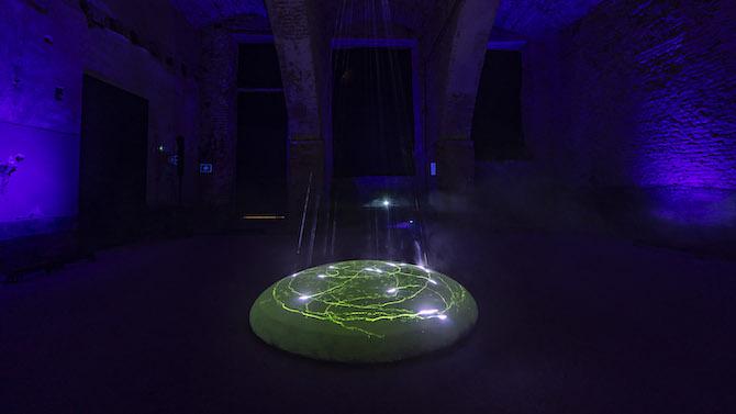 La mostra si snoda in un percorso che attraversa due sale di Palazzo del Capitanio. Un primo ambiente accoglie il visitatore e introduce il tema della mostra attraverso l’esposizione di opere e video generativi di super-fluidi iridescenti. Accedendo alla sala successiva, il visitatore si troverà all’interno di un’installazione artistica site specific. L’opera immersiva sarà composta da una multiproiezione che popolerà le volte del soffitto di organismi bioluminescenti mentre lo spazio centrale della sala sarà occupato da una semisfera con cui interagirà una luce laser che evocherà tra i mondi superflui anche quello del vino. L’installazione obbligherà ad abbandonare i tradizionali punti di riferimento visivi e uditivi per immergersi in un mondo immaginifico e superfluo e vivere l’ossimoro dell’utilità dell’inutile.