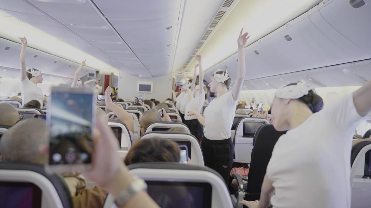 Yvon Demol, ballerino dell'Opéra di Parigi, ha creato una speciale coreografia per l’occasione, adattata allo spazio disponibile dei corridoi dell'aereo. I ballerini sono stati, quindi, in grado di offrire uno spettacolo unico, accompagnati dalle eccezionali musiche de Le Quattro Stagioni di Vivaldi e de Il Lago Dei Cigni di Ciajkovskij.