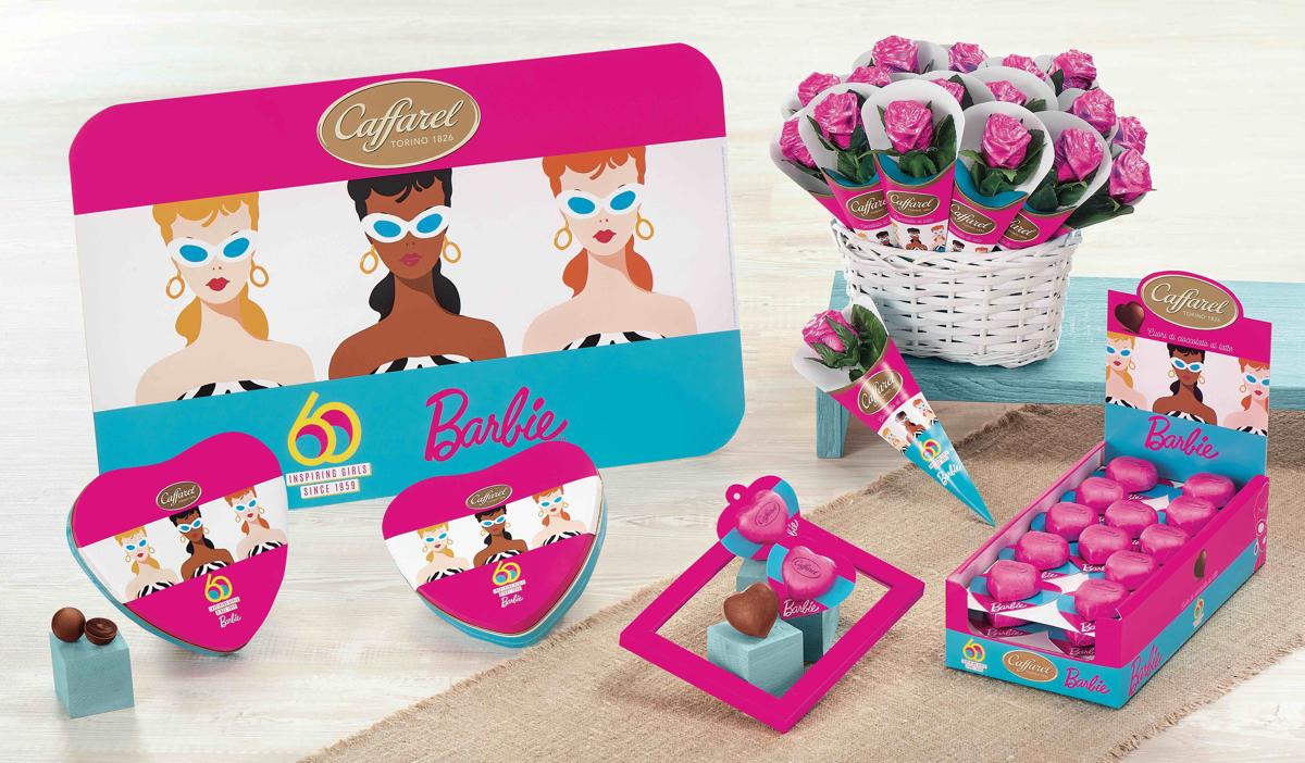 Caffarel rende omaggio all’icona della cultura pop mondiale con una collezione composta da dolci cuori di cioccolato al latte racchiusi da un brillante incarto rosa, una scatola di latta - a forma di cuore - che racchiude golose sferette di morbido cioccolato al latte e una dolce rosa sempre di cioccolato al latte - ovviamente - di colore rosa. La grafica delle confezioni riprende le immagini celebrative del 60° anniversario e vede raffigurata l’iconica e riconoscibilissima Barbie First Doll del 1959, con costumino a righe e occhiali da sole.