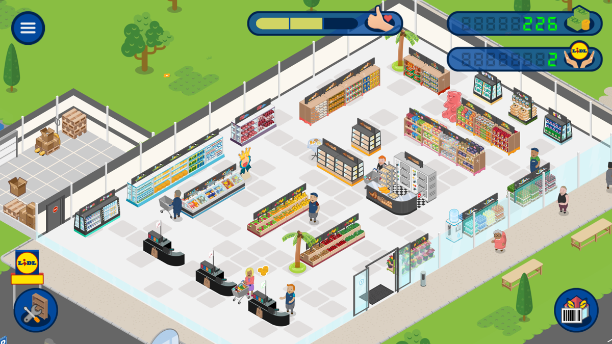 In “My Lidl Shop”, infatti, protagonista diventa il cliente. Ogni giocatore è chiamato a creare il proprio negozio Lidl e a gestirlo al meglio, partendo da un semplice locale e arrivando ad un supermercato sempre più completo e accessoriato. Portando a termine le appassionanti attività quotidiane e aumentando di livello, l’utente potrà arricchire e personalizzare sempre di più il proprio store virtuale, inserendo nuovi prodotti, aggiungendo elementi decorativi, ampliando il parcheggio, o assumendo collaboratori che lo aiutino a far crescere il proprio market.