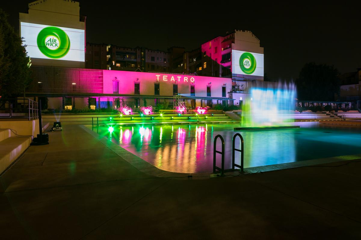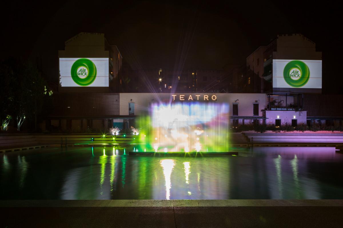 Per enfatizzare la nuova caratteristica di prodotto, oggi più puro (meno 95% di acqua aggiunta) nelle nuove referenze Air Wick Pure, il live show della serata è stato prodotto con un esclusivo spettacolo di water projection e fontane d’acqua danzanti, con un impianto in grado di ricreare un muro d’acqua alto 40 mt in continuo movimento dove è stato proiettato e mappato il nuovo