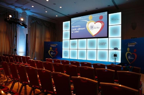 La plenaria è stata allestita con un palco colorato con luci blu e da una scenografia a cubi LED colorati e personalizzati con il nuovo brand Lasonil.