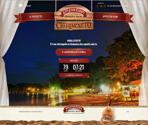 La campagna 'Appleton Chringuito - #mollotutto' promossa da Appleton Estate Italia offrirà inoltre la possibilità, a partire da febbraio 2015, di vivere l’atmosfera giamaicana presso il Chiringuito Appleton in Giamaica e di andare alla scoperta di questa magnifica isola, delle sue tradizioni e dell’approccio alla vita positivo e passionale dei suoi abitanti.