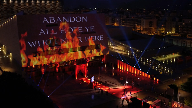 Per vestire il teatro da 'Inferno dantesco' e dare l’impressione che fosse avvolto dalle fiamme, è stato realizzato un doppio video mapping sia sulla facciata principale che sulla superficie concava del foyer. La grande sala del teatro non è stata tralasciata: anche qui il fuoco ha avvolto tutta la superfice della balconata, attraverso un ingegnoso sistema di effetti luminosi. Le installazioni sono state completate da suoni ed effetti ideati da un sound designer che hanno contribuito alla creazione di un’atmosfera infernale.