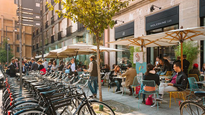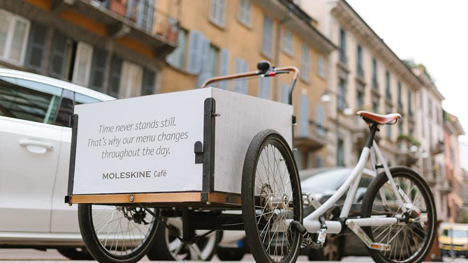 L'attività ha visto la consegna speciale della merenda presso i principali uffici e show room del quartiere, a bordo di una Cargo Bike Moleskine Café.