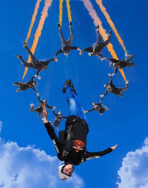 Insieme a Roberta Mancino, protagonisti di questa esperienza da brivido anche dieci paracadutisti - tra loro Pablo Hernandez, campione del mondo di 'Canopy Piloting' - che, per primi, si sono lanciati in caduta libera disegnando nel cielo una 'stella piatta', ovvero una formazione a cerchio con il corpo disposto parallelamente al terreno. Grazie a fumogeni assicurati ai loro piedi il gruppo di paracadutisti ha creato un vero e proprio tunnel verticale della lunghezza di ben 3 km.