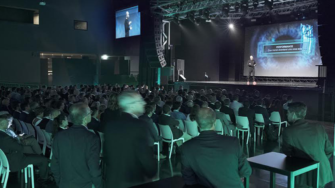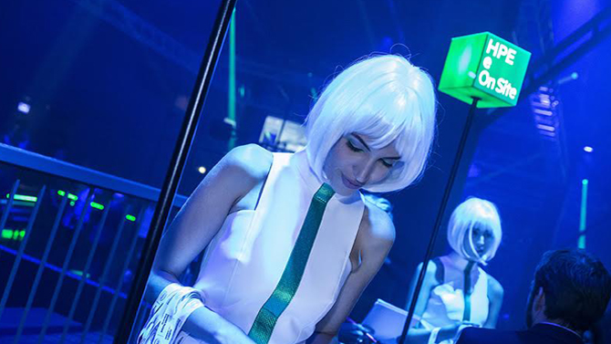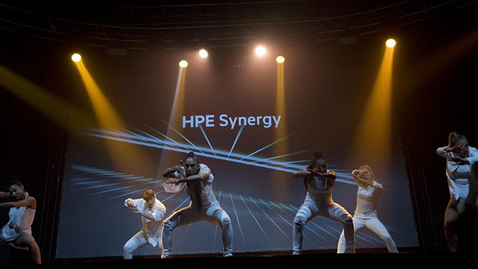 Dopo la fase di welcome, gli ospiti hanno preso posto nel parterre mentre gli schermi, sul palco e laterali, proponevano le immagini della galassia. Un video in 3D sulla tecnologia HPE Synergy ha introdotto le riprese della performance live di danza dal ritmo serrato per rappresentare il concetto di velocità e accelerazione della nuova piattaforma HPE.