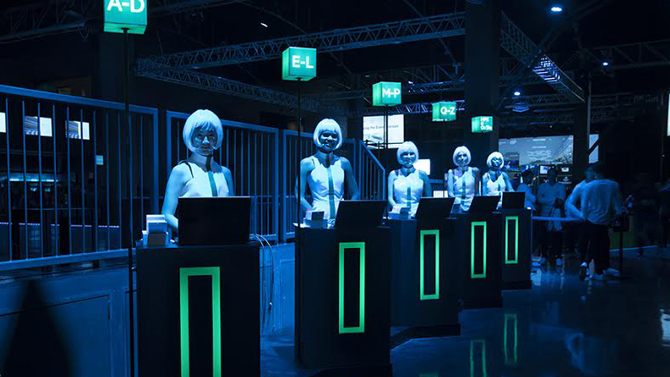 L’ingresso degli ospiti all’evento, iniziato alla ore 17, è avvenuto attraverso un portale che fungeva da gate di partenza e che precedeva l’area accredito, presieduta da hostess in look futuristico che hanno consegnato ai partecipanti il badge/carta d’imbarco.