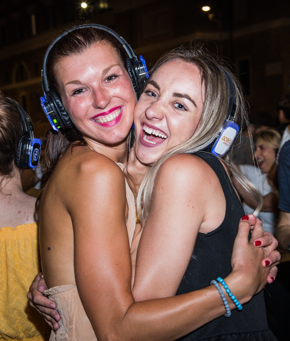 A partire dalle 21:00 centinaia di persone sono scese in pista per ballare “in silenzio”, grazie alla musica trasmessa da cuffie bluetooth, sullo sfondo di una delle piazze più belle della Capitale.