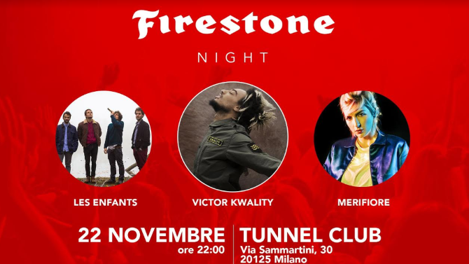 Mercoledì 22 novembre dalle ore 22 sono saliti sul palco del Tunnel di Milano i primi tre classificati del contest 'Road to the Main Stage', progetto unico per gli artisti emergenti durante il quale Firestone ha chiamato in gioco tutti gli appassionati di musica, chiedendogli di votare il proprio artista preferito tra i nomi selezionati dal panorama indie italiano.