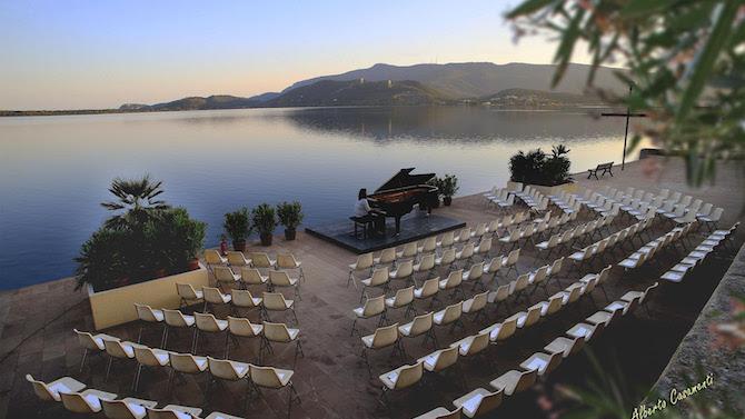 Il pianoforte che suona ovunque: nella scogliera a picco sul mare di Talamone, mentre si attende l’alba nell’oasi WWF di Casale Giannella e ancora sulla Terrazza Guzman spalancata sulla laguna di Orbetello, oppure fra le possenti mura del Forte Saline di Albinia.